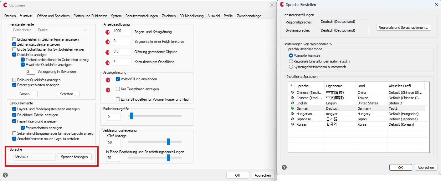 Die Sprache kann in den Optionen (Befehl: _OPTIONS) im Register „Anzeigen“ geändert werden. Nach der Umstellung ist ein Neustart von CADian erforderlich.